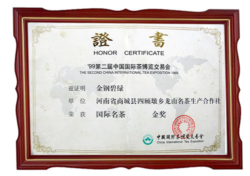 金刚碧绿获国际名茶金奖证书
